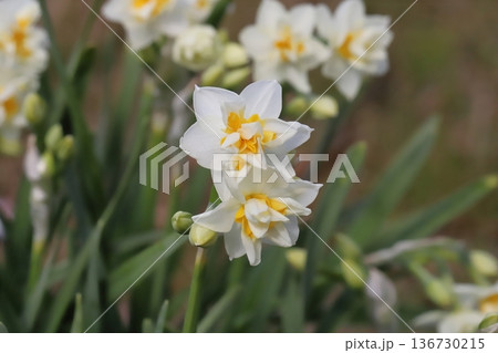 冬の公園に咲く白と黄色の2色の八重咲きフサザキスイセンの花