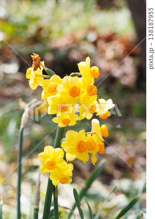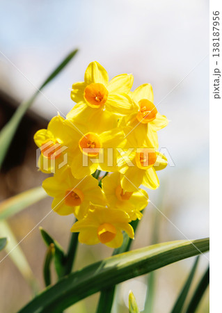 冬の庭に咲く早咲きのフサザキニホンスイセンの花