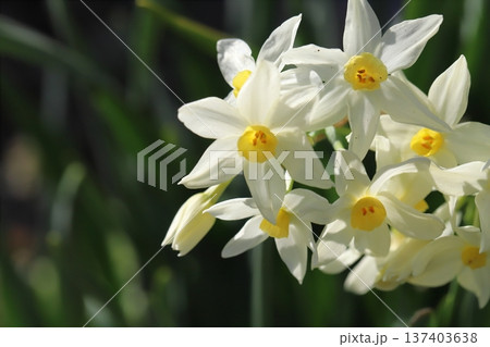 早春の庭に咲く白い花びらで中心がオレンジ色のフサザキスイセンの花