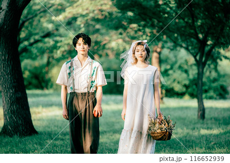 ピクニックをしながら前撮り撮影をする新郎新婦