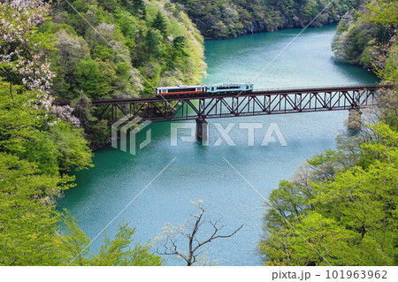 只見線 新緑の第三只見川橋梁を渡る列車(福島県三島町、4月下旬)
