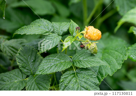 Yellow raspberries on the branch are starting to ripen, growing berries