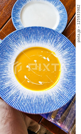 Tasty yellow cream soup in the restaurant on the beautiful blue plate.