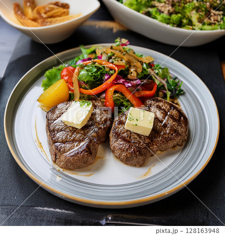 Grilled king shrimps served with trasty sauce. Sea food in restaurant