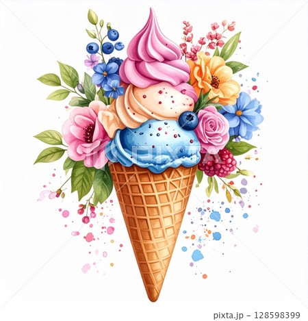 Ice Cream Cone with Colorful Flowers and Whipped Cream