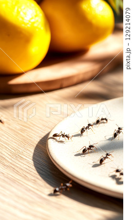 Ants on ceramic plate in sunlit kitchen with fresh lemons in background, AI Generative
