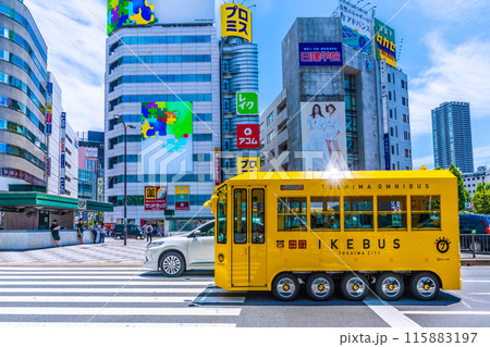 日本の東京都市景観 池袋駅東口。右奥に黄色いイケバスが見える