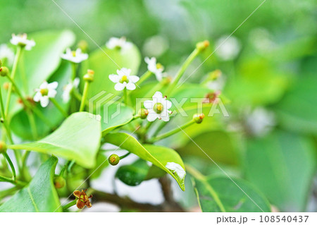 枝葉の付いた満開のお茶の花 のイラスト素材 【手描き水彩画】白背景 透過背景