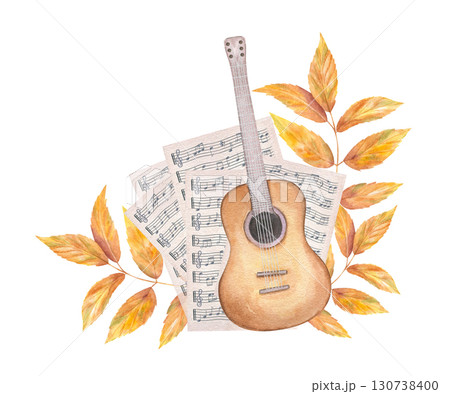 Acoustic guitar on sheet music paper and golden leaves watercolor illustration on isolated background. Hand drawn classical string instrument, musical note sheets, autumn leaf branches for posters