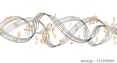 Undulating levitation music notes. Multicolored Notes flying through the waves of music. Seamless banner of note symbols. Watercolor illustration in classic style. Ornate isolated on white.