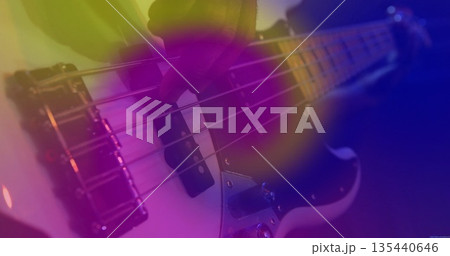 Plucking musician's gloved hand fretting strings on bass guitar on stage, with metal bridge pickups