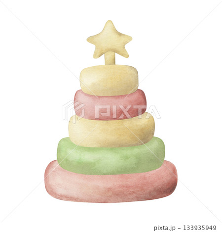 Watercolor stacking toy illustration with soft pastel rings in yellow, pink, green, topped with a cute star. Boho nursery decor, baby development toy art, gentle infant design, minimal wooden style