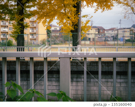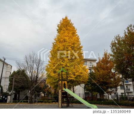 秋の公園風景:見事に色づいたイチョウの木と子供用滑り台