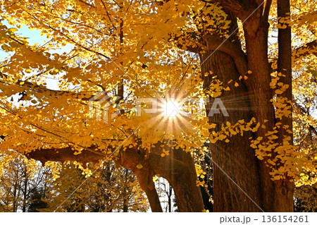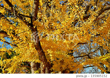 晴れた青空の下で黄色く紅葉した秋のいちょうの木