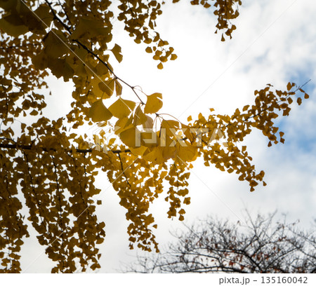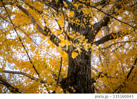 黄葉するイチョウの葉 馬場記念公園 夕景