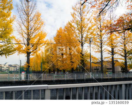 秋晴れに映える黄葉の並木道と河川敷の風景