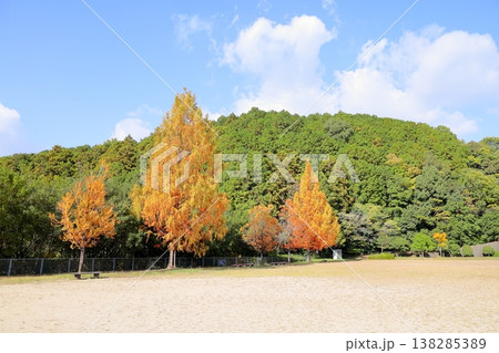 秋の公園 色づくメタセコイアの木