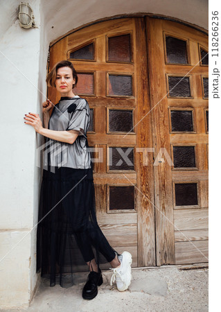 Beautiful woman 40 years old walking through the streets of the city in different shoes