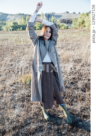 A woman in a yellow coat and tan skirt is standing in front of a brick wall