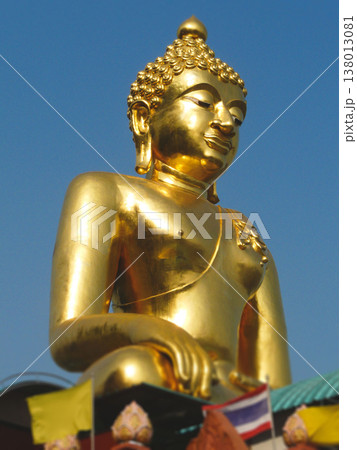 Close-up of Big golden Buddha statue with Lanna style located at Golden triangle the area where the borders of Thailand, Laos, and Myanmar meet at Mekong rivers.