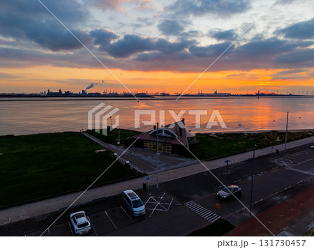 Aerial sunset view of coastal zone parking lot, triangular roofed lookout, grassy shoreline, and smokestack lined harbor contrast with wind turbines and golden sky over reflective water.