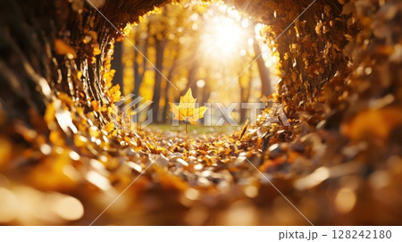 Swirling autumn leaves illuminated in a forest corridor with sunlight rays and vibrant golden tones