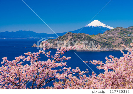 (静岡県)西伊豆黄金崎 早咲き桜の向こうに富士山 午後