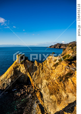 静岡県/ 夕刻が迫り黄金色に輝き出す黄金崎の風景(馬ロック)