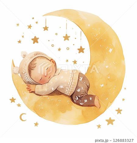 Sleeping baby rests peacefully on a crescent moon surrounded by twinkling stars in a serene night sky