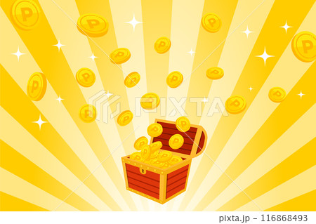 コインの入った赤い宝箱と集中線とキラキラ