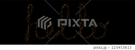 Thin golden curved Hello lettering of shiny sparkling particles abstract background