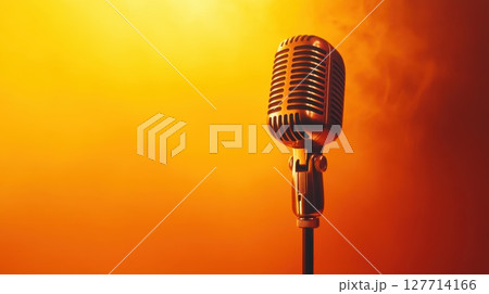 Vintage microphone stands against a vibrant golden background during a live performance setting, capturing the energy and excitement of the moment with spotlight effects
