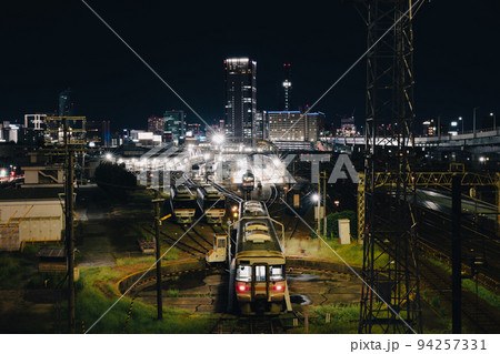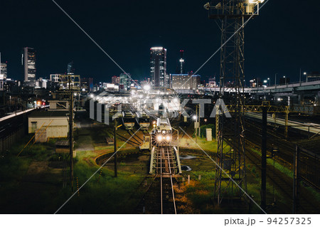 名古屋市の黄金跨線橋から見た転車台と線路、高層ビル群の夜景