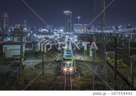 名古屋市の黄金跨線橋から見たJRとあおなみ線の線路、貨物列車、高層ビル群の夜景