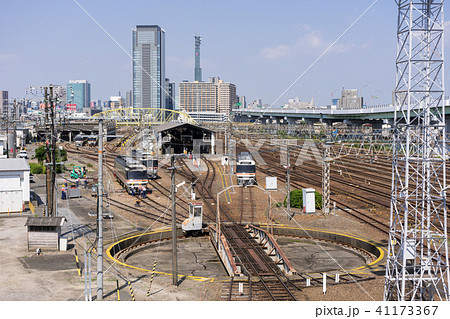名古屋市の黄金跨線橋から見た転車台と線路、高層ビル群、近鉄電車の光跡