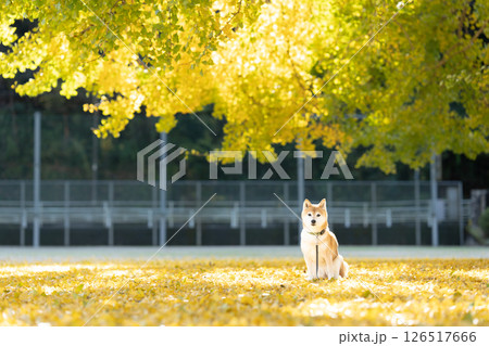 イチョウの木の下で遊ぶ柴犬 可愛い柴犬 柴犬茜