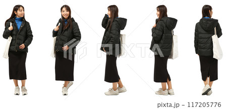 黒いダウンコートを着た女性の全身人物切り抜き素材