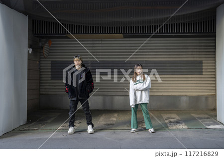 カメラ目線の20代の男性 ストリート系ファッションイメージ ポートレート
