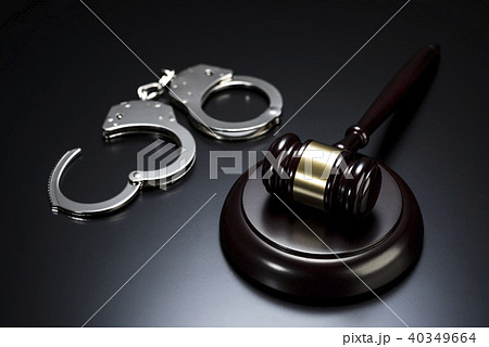 The image features a judge's gavel, handcuffs, and a handgun on a blue background.