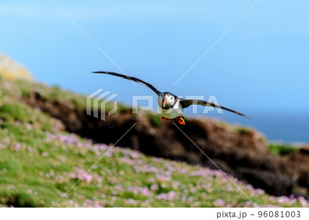 Puffin landing with fish