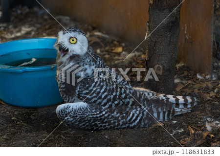 A white owl sits with its beak open. A white owl at the Minsk zoo