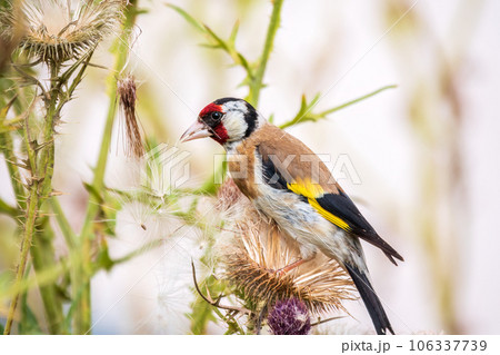 European goldfinch, feeding on the seeds of thistles. Carduelis carduelis.