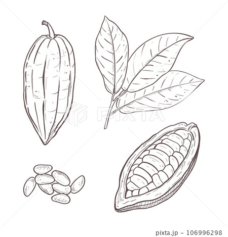 Vector illustration set of cocoa leaves, peeled and closed beans and seeds. Black outline of branch, graphic drawing. For postcards, design, prints, poster, stickers, menu, logo, textile, encyclopedia