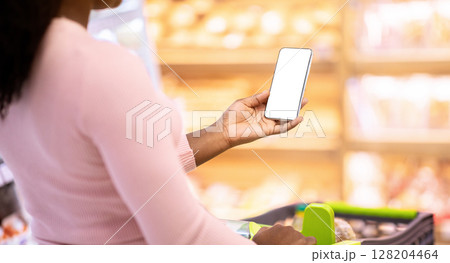 Unrecognizable black woman with shopping cart holding smartphone with blank screen at supermarket, mockup for grocery list app design. Closeup of young lady with mobile device at store