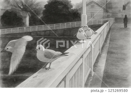 橋の上で夕陽を浴びるカモメたち