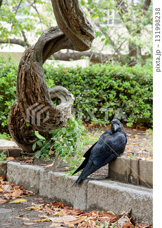 渦巻く木の横に佇むカラス