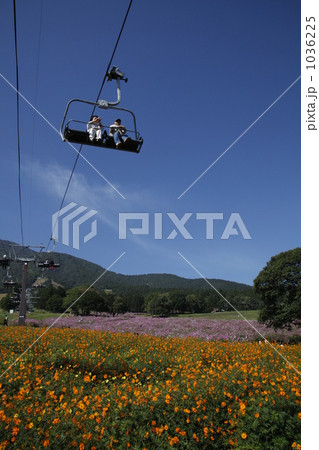 アナログ水彩風景画満開のコスモス畑とリフト