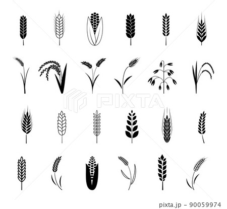 Wheat ear icons set. Barley and corn cereal, rye and rice grain, black silhouettes decorative isolated bakery elements collection, seed harvest for farm bread or beer. Organic food illustration vector