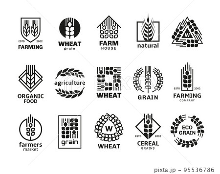 Wheat ear. Grain logo. Black silhouette icon design with rye spikelet and text word. Bakery logotype. Farm products. Agriculture sign. Seeds harvest. Organic oat flour. Vector symbols set