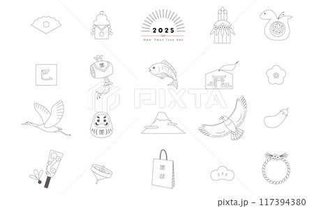 2025年巳年の年賀状などに使えるお正月のイラストのセット 線画バージョン